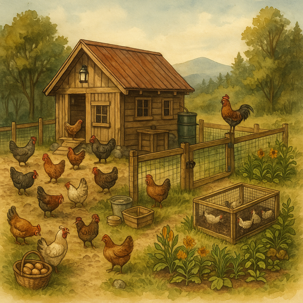 Poultry are mobile by design. Chickens and other birds follow grazing animals and garden cycles, spreading fertility, reducing insect pressure, and producing eggs and meat.